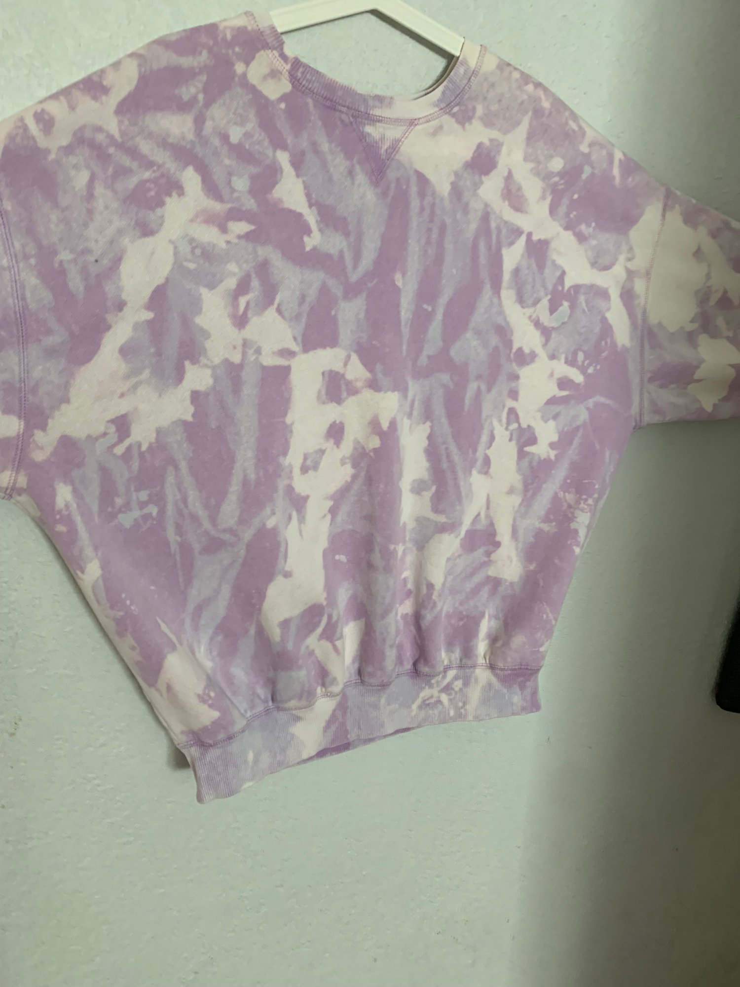 Reverse dyed crewneck sweatshirt in blue lavender cream color, size 2X. Price includes shipping in the USA.