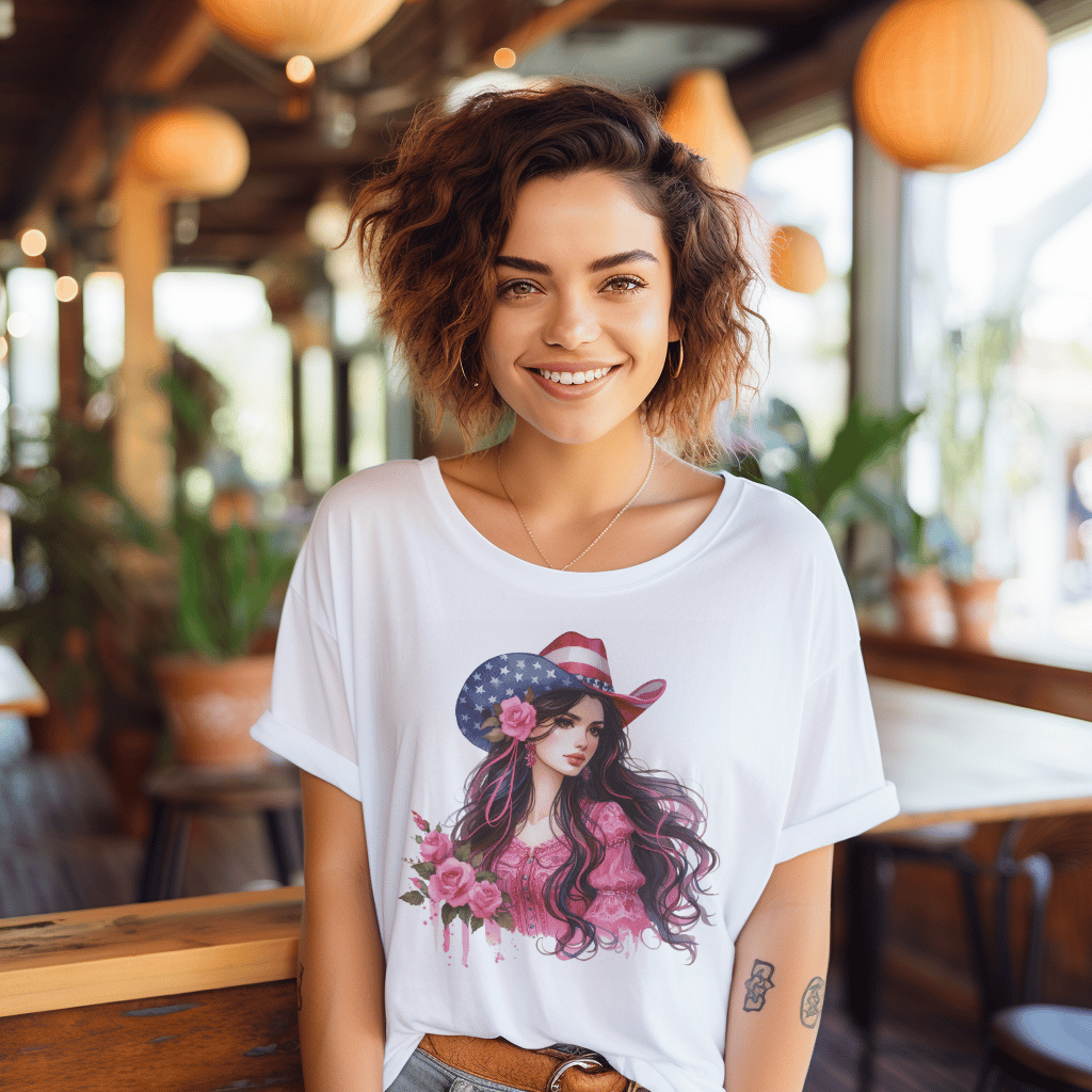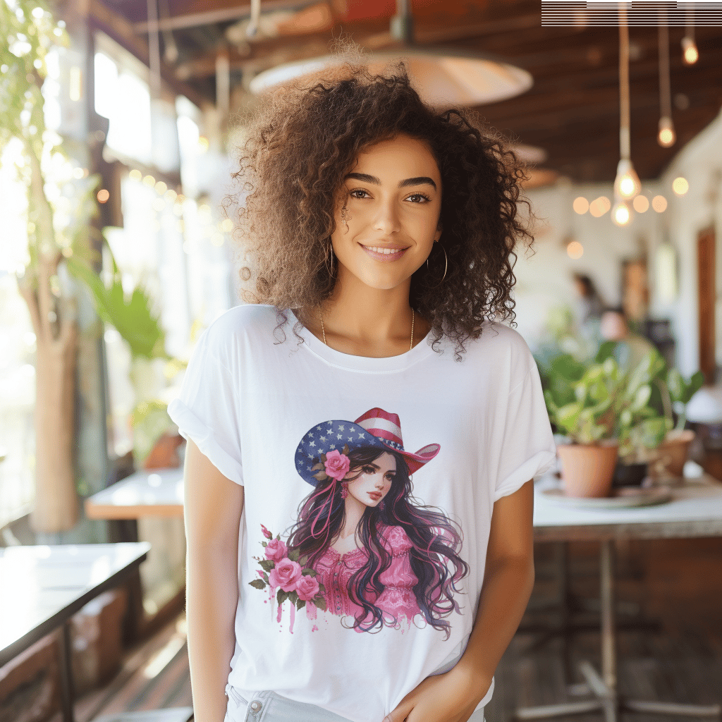 Pink Cowgirl Brunette 4th of July Flag TShirt