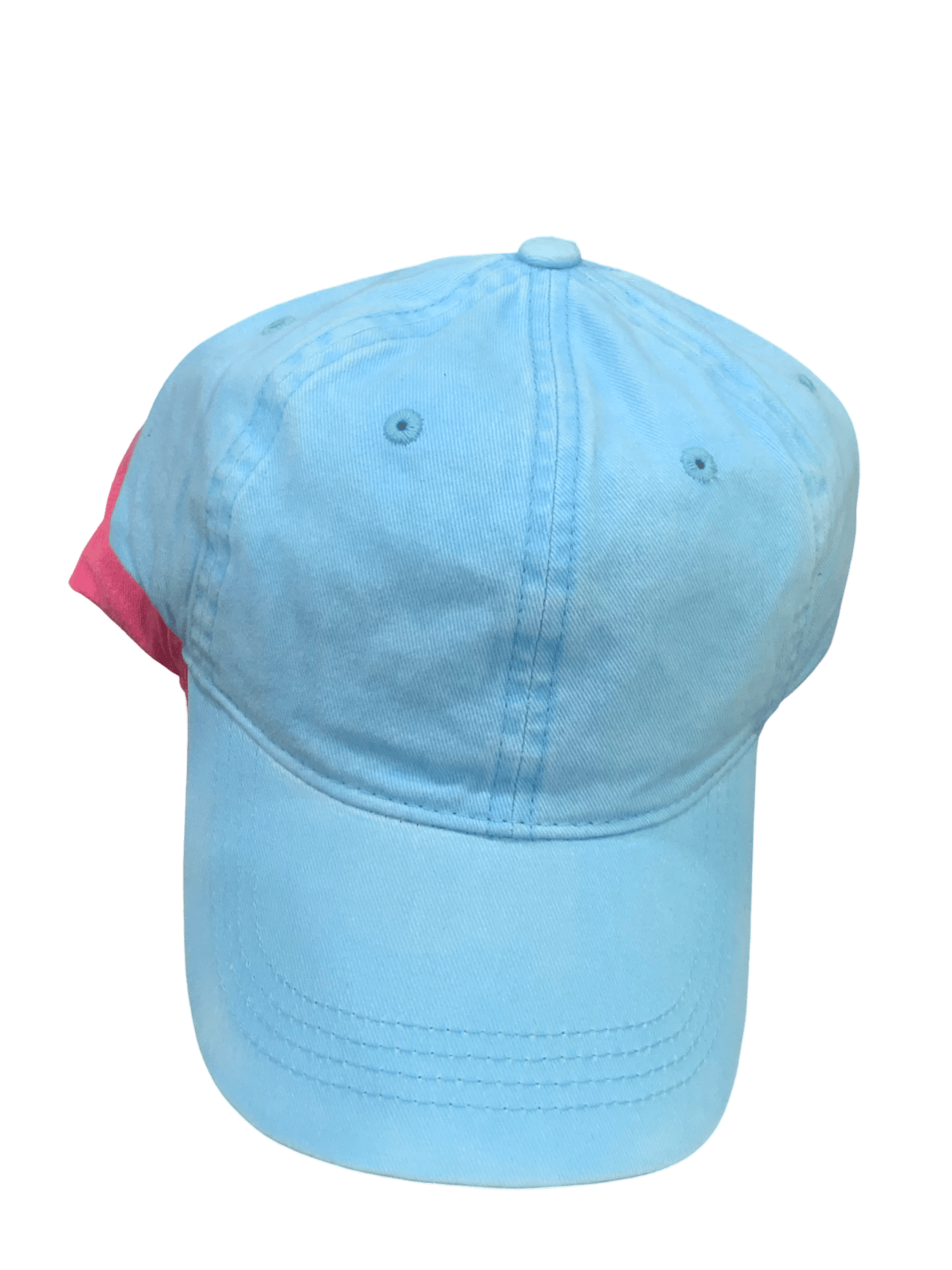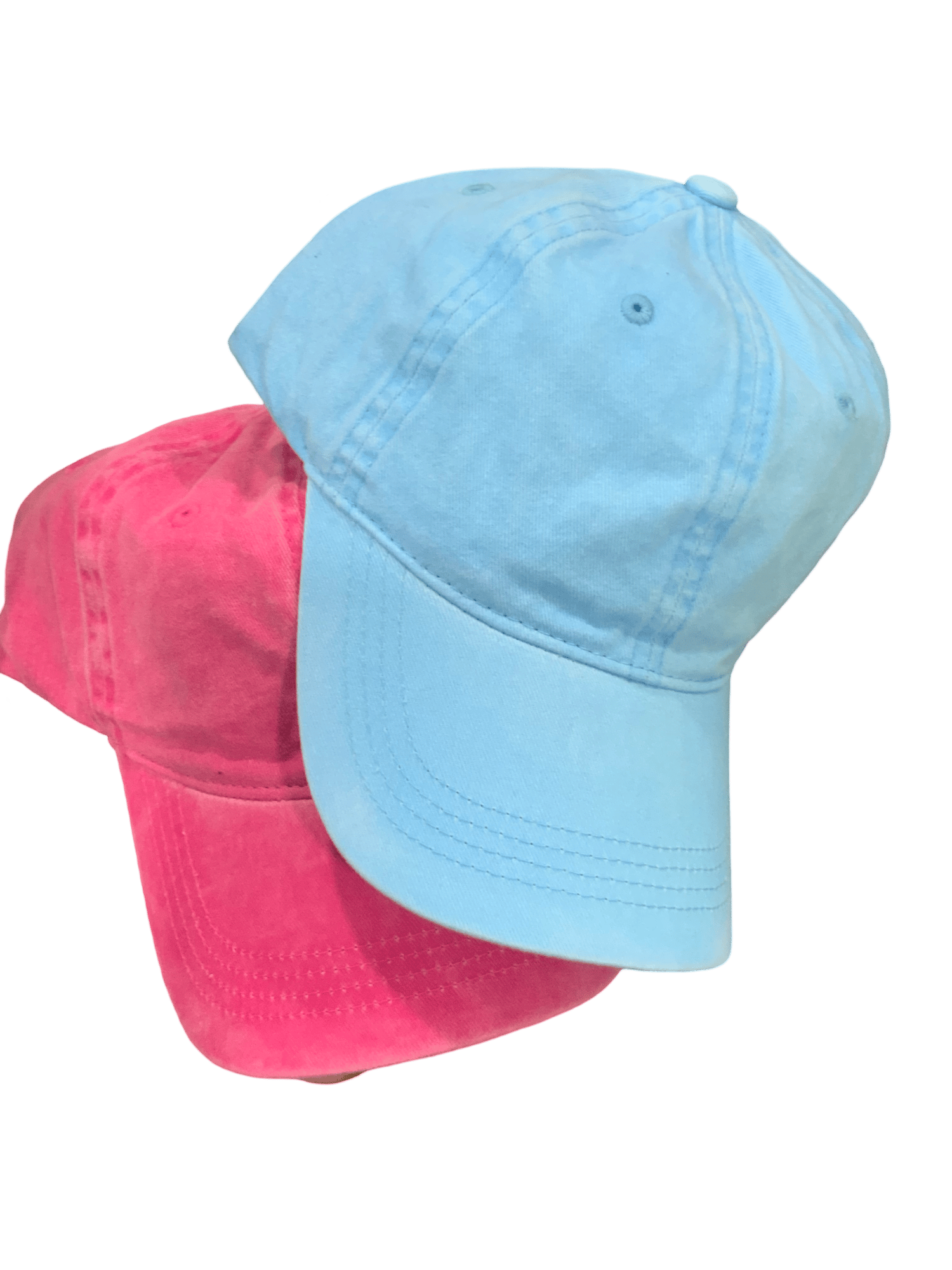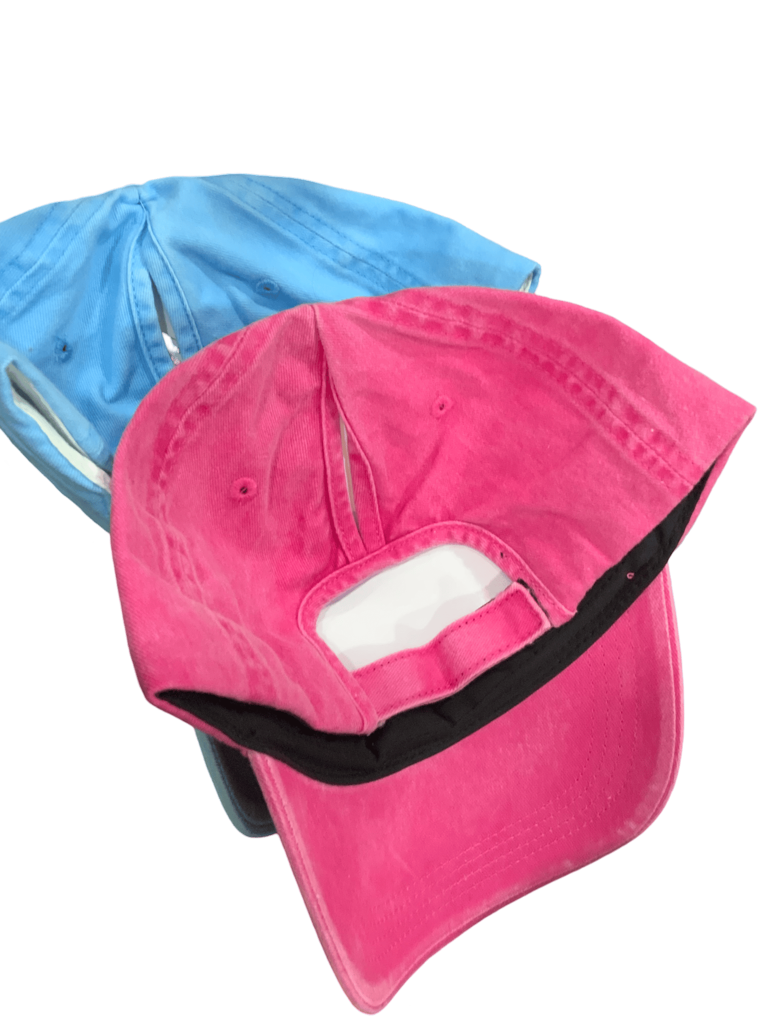 Awesome pigment dyed colorful ponytail baseball hats made and shipped from our Denver Metro studio. Different embellishments options are available also.